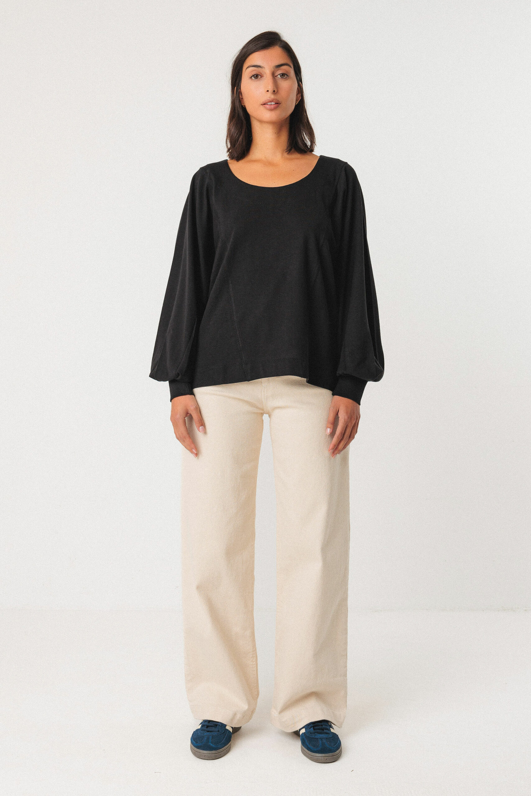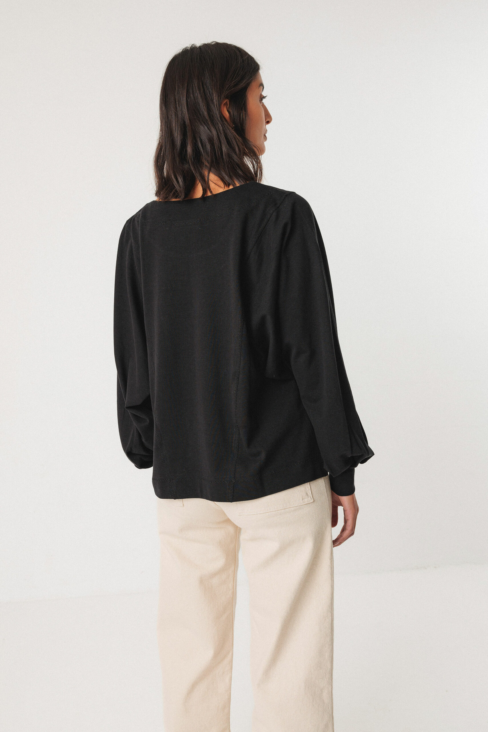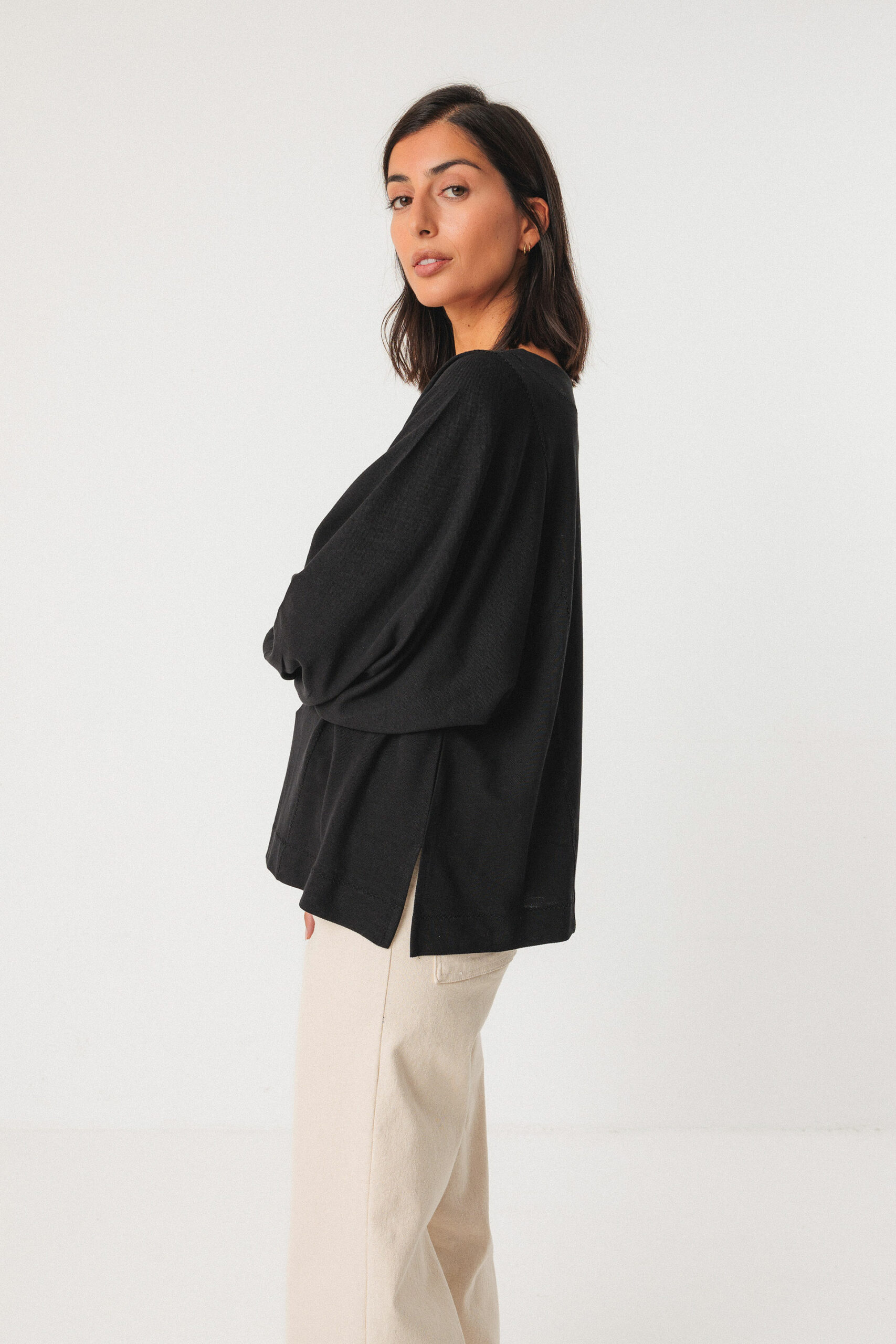 & Free ShippingBlusa holgada con cuello redondo y mangas estilo murciélago. Detalles plisados en los puños y aberturas laterales.