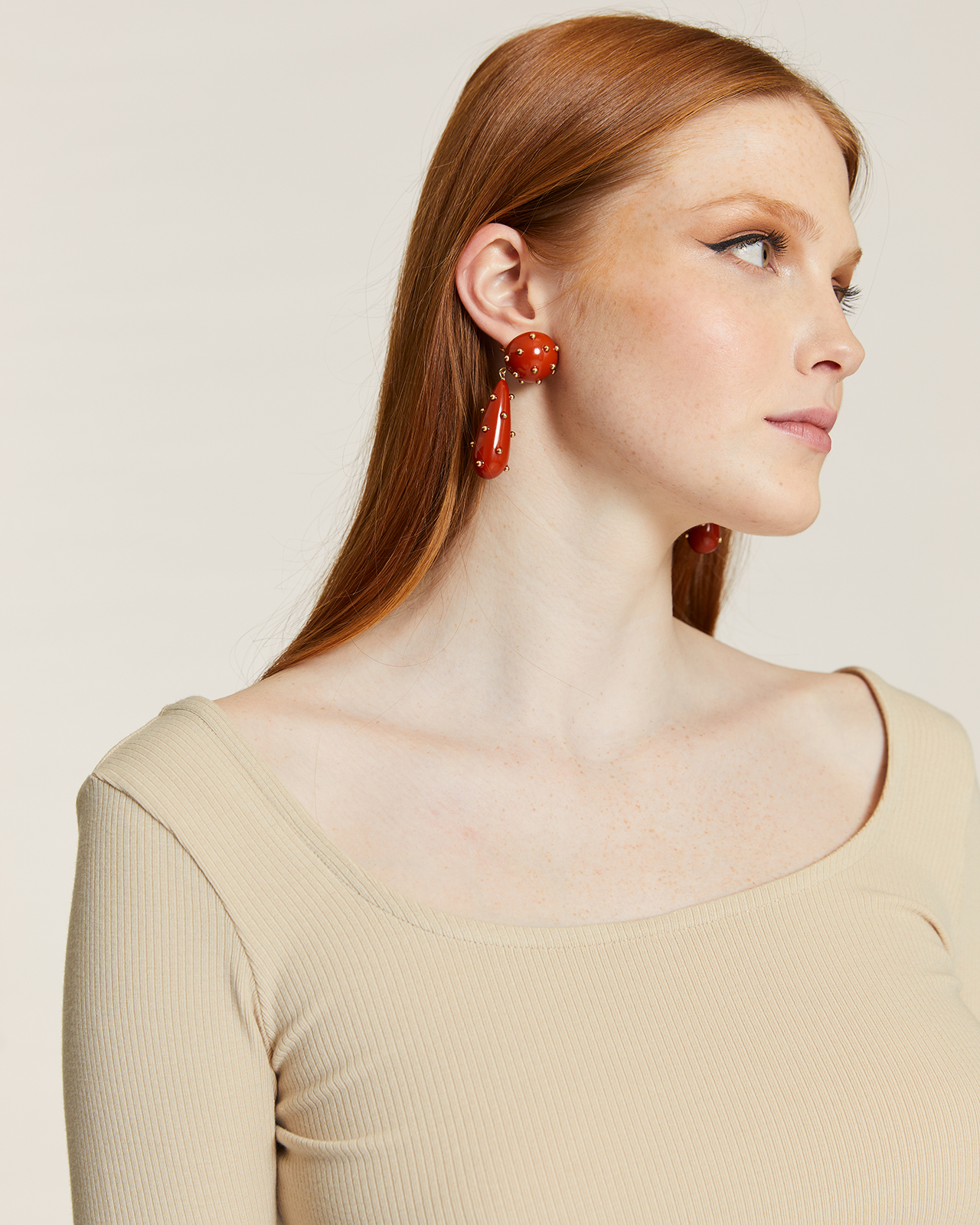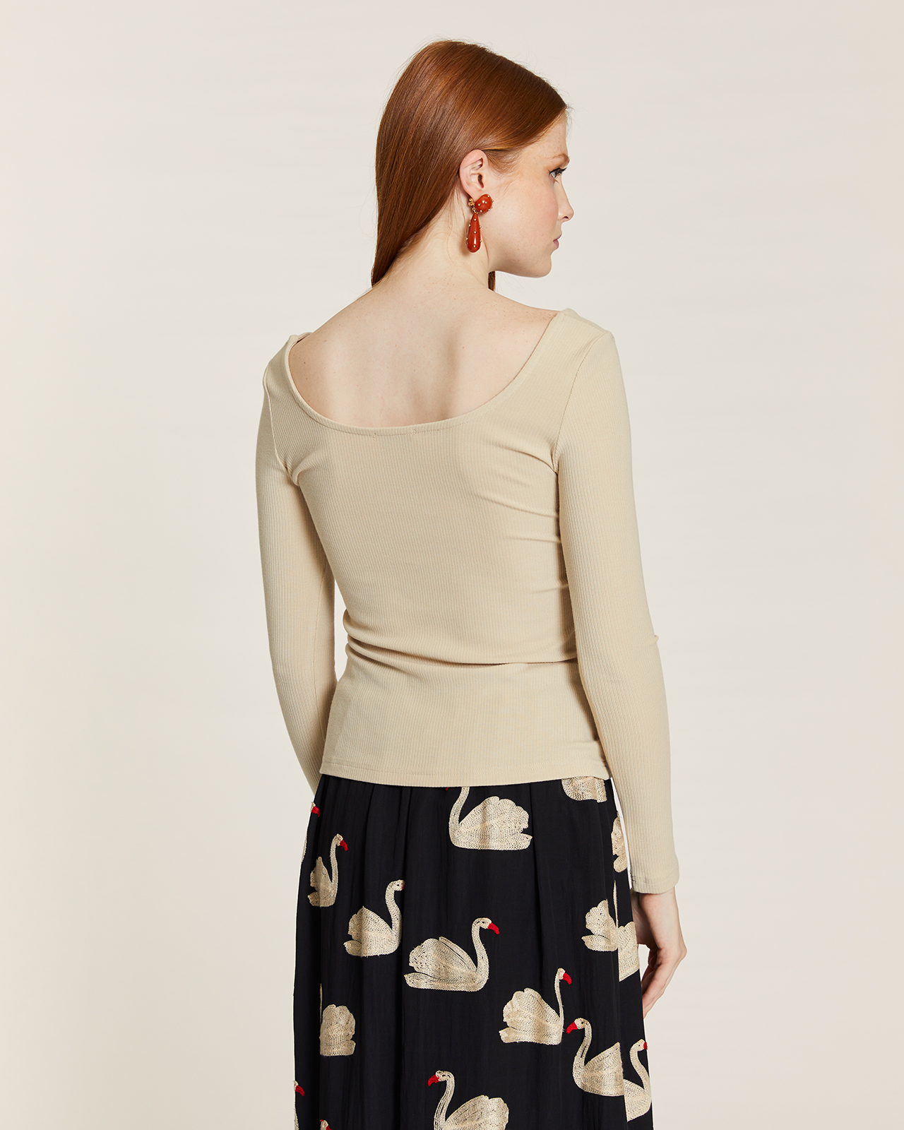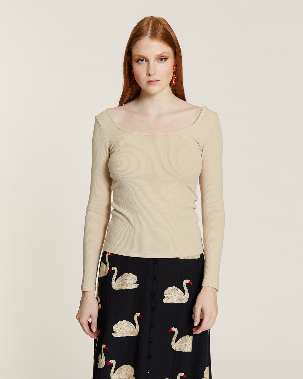 & Free ShippingTop ajustado de canalé crema, mangas rectas y cuello estilo scoop.