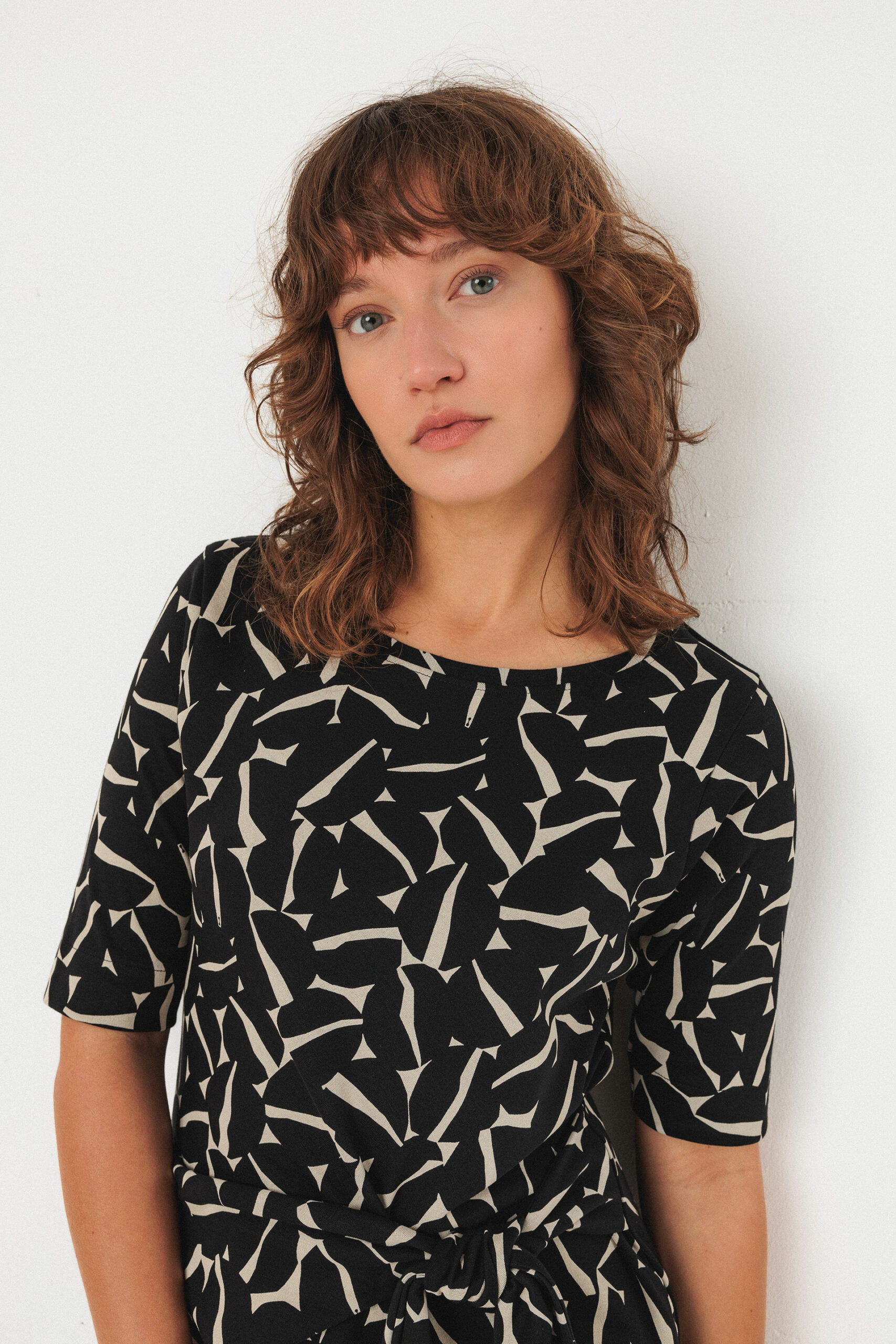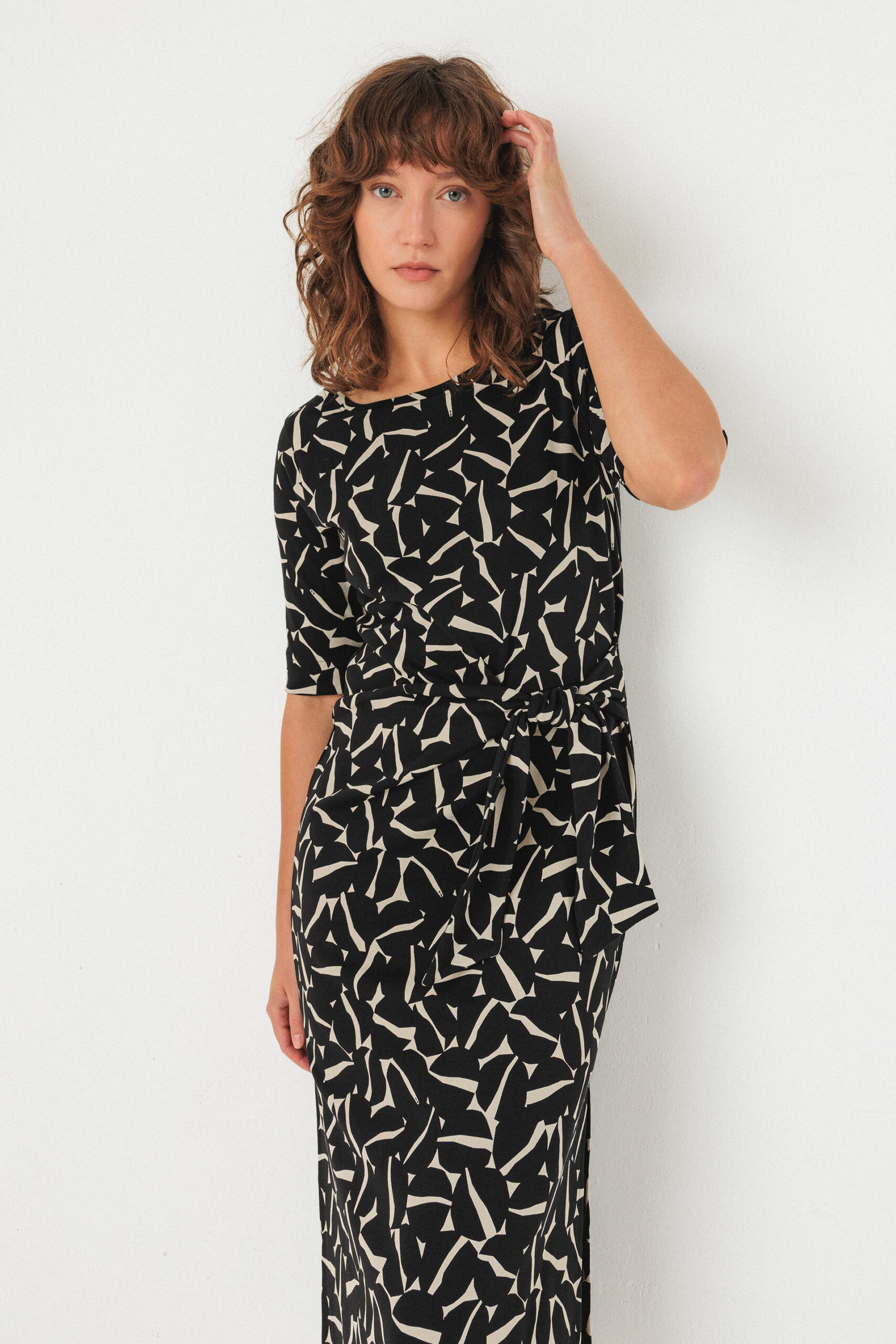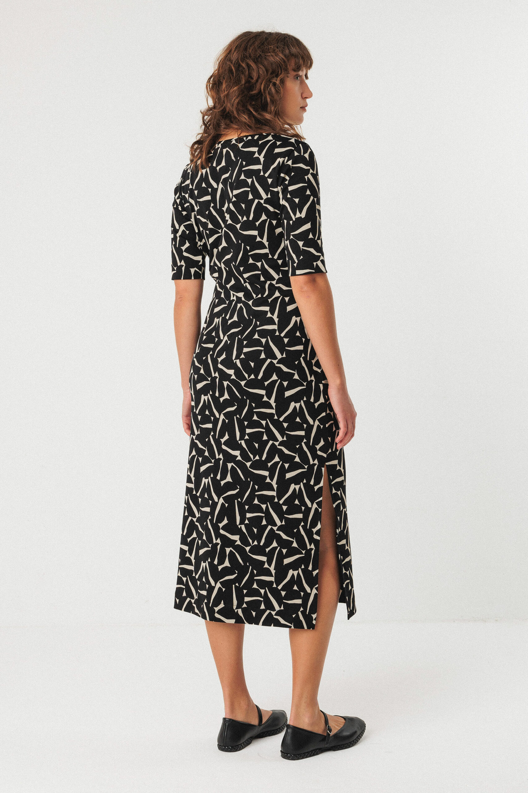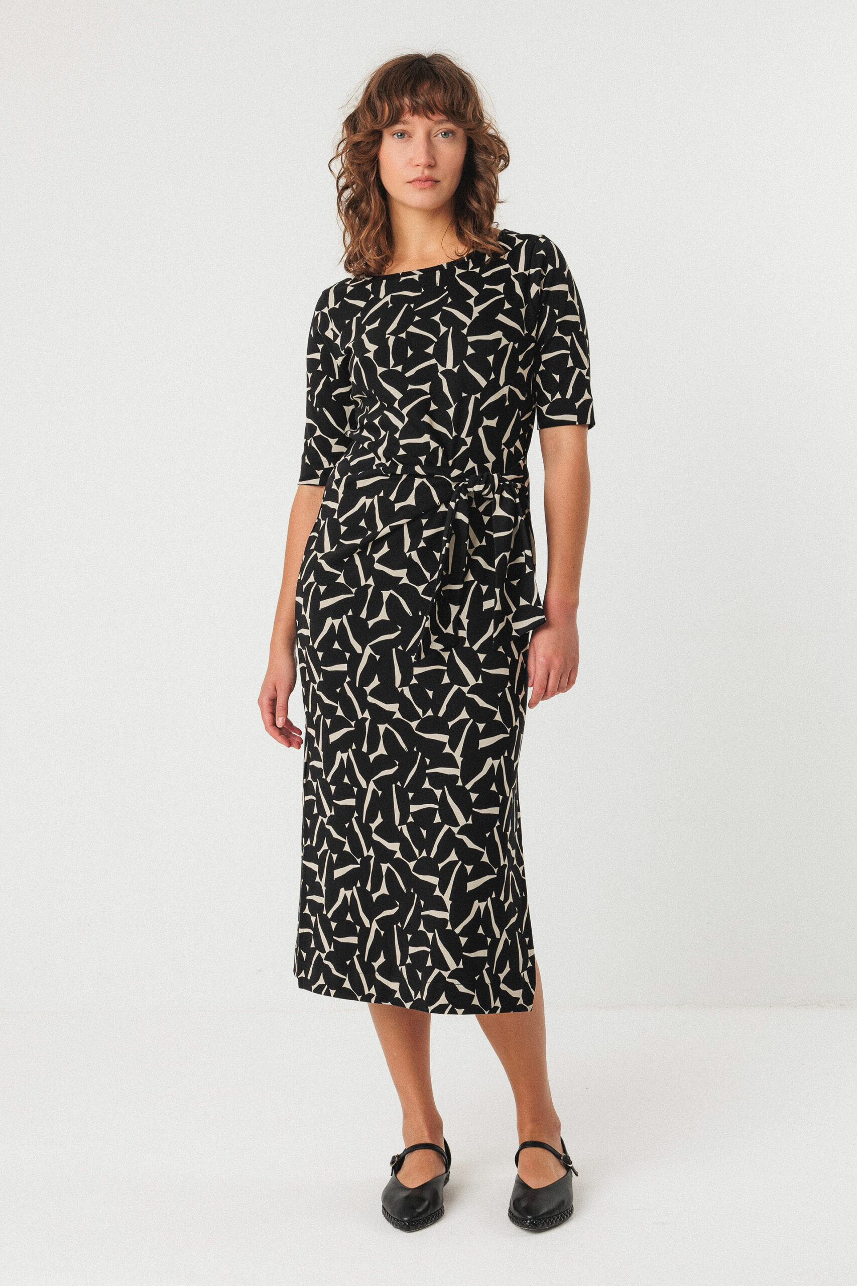 & Free ShippingVestido midi ajustado con cuello estilo barco, la manga es corta y con un detalle anudado en la parte delantera. Aperturas los laterales para mayor comodidad.